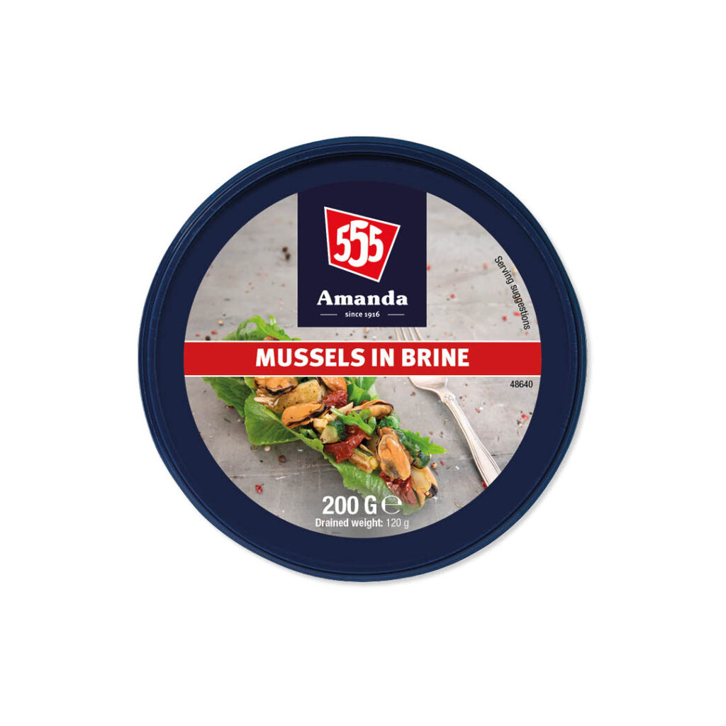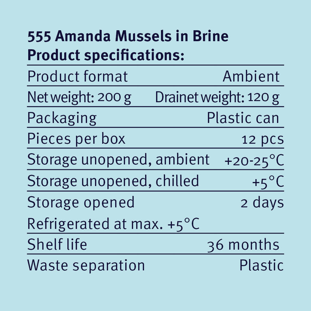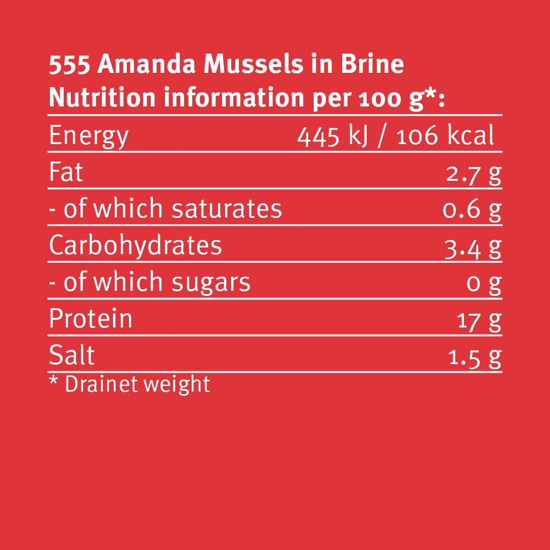 555 Amanda Mussels in Brine are made from high-quality blue mussels. The mussels are gently cooked and packed in a light brine to preserve their natural flavour and firm texture.